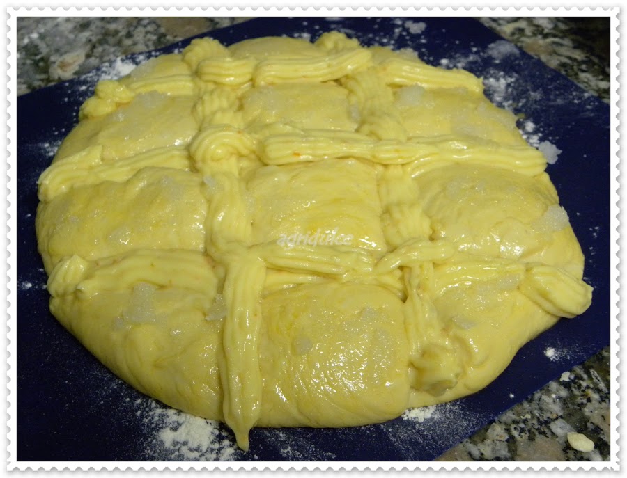 Poner azúcar normal en un plato, echar unas gotas de agua para que se humedezca. Espolvorear la larpeira con éste azúcar y con trocitos de mantequilla.