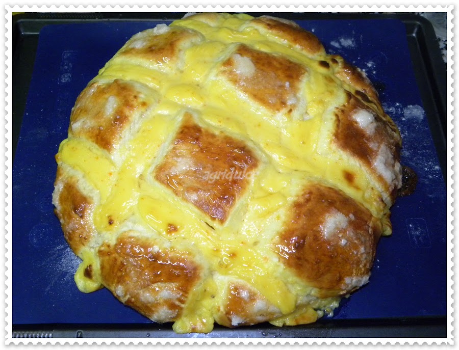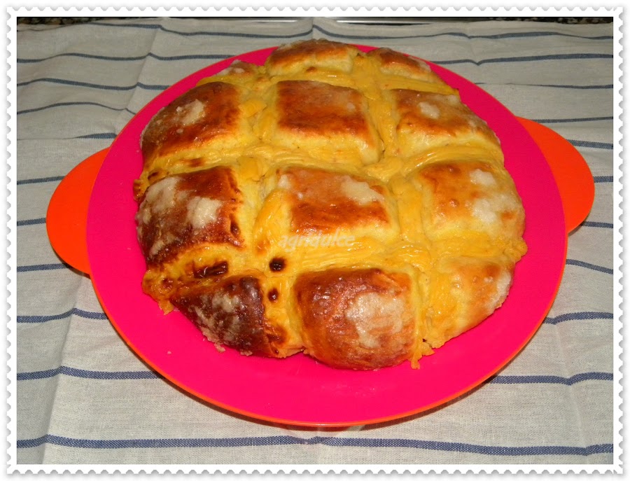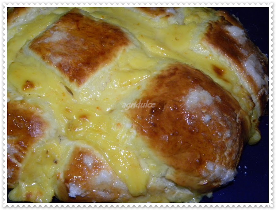 En ese momento poner por encima la crema pastelera con una manga y meter en el horno precalentado a 200 grados durante unos 25 minutos.