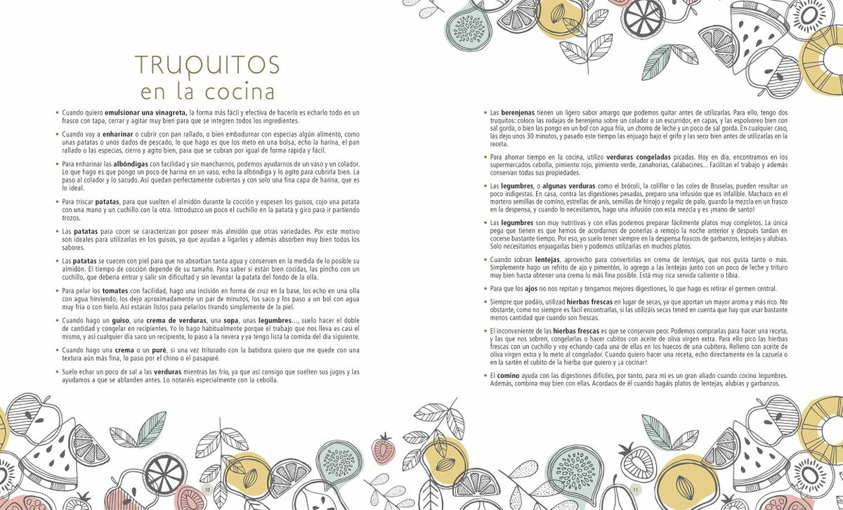 Además de las recetas, todas saludables y muy ricas (no es incompatible una cosa con la otra), cada una de ellas incluye el listado de ingredientes, todos ellos al alcance de cualquiera y de los que se encuentran en cualquier mercado, así como la explicación de su elaboración y la foto del resultado final. Añade algunas notas sobre el cocinado o los ingredientes que se pueden sustituir por si alguno de ellos no es del gusto de los comensales, sugerencias variadas o algún dato sobre las propiedades específicas de los citados ingredientes, además de ideas de presentación.