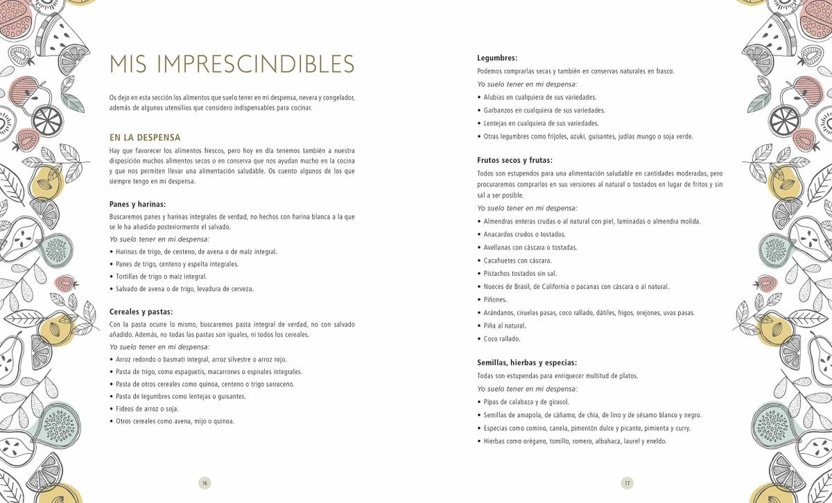 Para conocer cuáles son los ingredientes indispensables que ocupan la despensa, la nevera y el congelador de la bloguera, hay que consultar el apartado “Mis Imprescindibles”, donde te cuenta qué tiene siempre en su despensa, porque tal como ella misma indica “hay que favorecer los alimentos frescos, pero hoy en día tenemos también a nuestra disposición muchos alimentos secos o en conserva que nos ayudan mucho en la cocina, y que nos permiten llevar una alimentación saludable”. Para cocinar no es necesario disponer de un montón de utensilios, incluidos también en este apartado, pero algunos, sin requerir grandes inversiones, facilitan mucho el trabajo como un buen cuchillo, una batidora potente, unas varillas eléctricas, una mandolina, una vaporera o un rayador.
