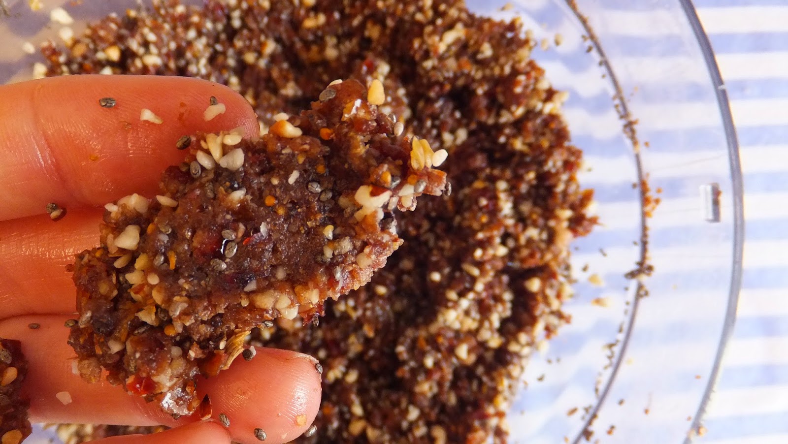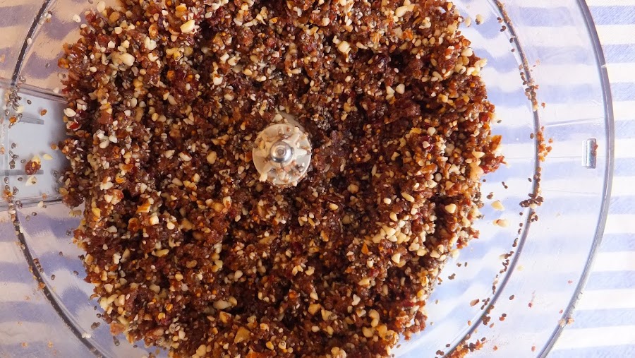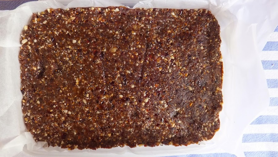 NOTAS1. Yo prefiero dejar las nueces medio molidas para que al morder las barritas tengan algo más de cuerpo y sean más crujientes, pero siempre se pueden hacer algo más lisas y homogéneas simplemente moliendo más las nueces.