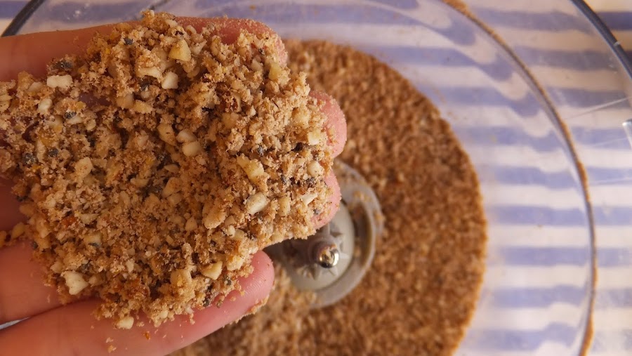 1. Tritura en un procesador de alimentos todos los frutos secos y las semillas junto a las especias y la proteína hasta formar una harina muy gruesa en la que no queden frutos secos sin triturar.