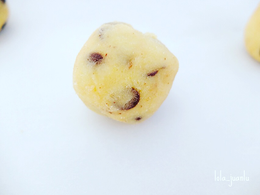 Sacamos la masa de la nevera y quitamos el papel film. Cortamos y hacemos bolitas con la masa. Colocamos las bolitas en la bandeja separadas entre si.