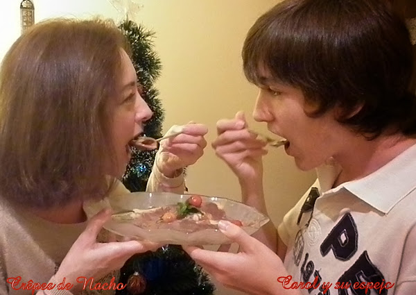 Nacho es mi catador oficial de mis comidas, todo lo que hago, al primero que le doy a probar los platos es a él porque se que va a ser hiper crítico!!!!!! Me encanta este momento, le llevo el plato de la foto, jajajajjaja Casi siempre se come el plato más bonito presentado, jajajajja, y me quedo mirándole muy fija para ver su cara y ..... . ¿ Que tal Nacho? Si Nacho dice uhmmmmmmm!!!! se que esto es de 10, jajajjaja Ahora como Nacho tuerza el ceño, uffff!!!! es que es chungo!!! . Bueno pero tengo que decir en mi favor que rara vez tuerce el ceño, jajajajja