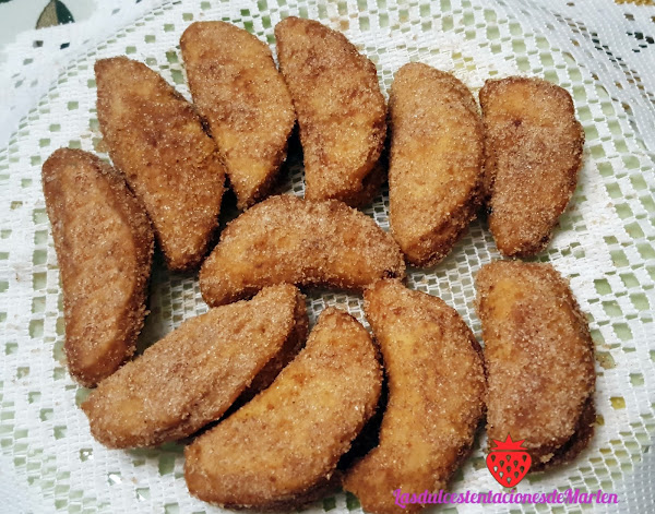 Cogemos bolas de masa y las extendemos con un rodillo, yo las he cortado con un corta-pastas y rellenado con una poquita de azúcar mezclada con canela. Se doblan por la mitas y se aplasta los filos con un tenedor para que no se habrán al freírlas. Las freímos en abundante aceite de girasol caliente ( yo le he puesto una cascara de limón al freír el aceite y luego se la he quitado). Miramos que estén doraditas y las pasamos a un plato con papel de cocina, y de ahí cuando están templadas las pasamos por una mezcla de azúcar y canela...Riquisimassss hay que probarlas.
