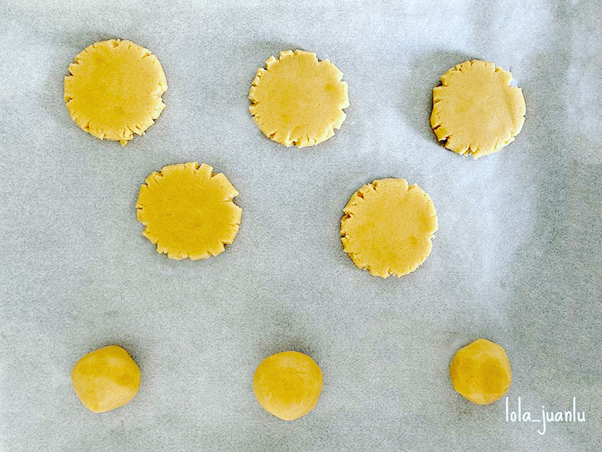 Con dos cucharadas de masa formamos una bola que colocamos en una de las bandejas que tenemos preparadas y presionamos con el fondo de un vaso para darle forma de círculo. Yo he utilizado un vaso de chato para ello.