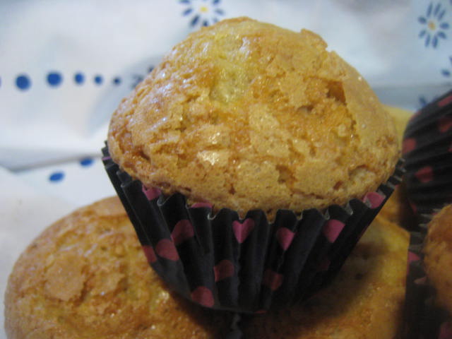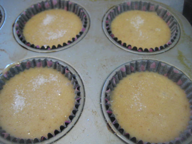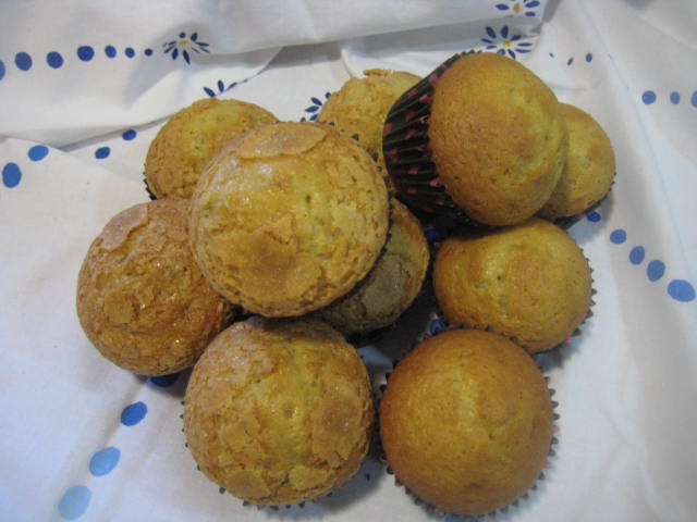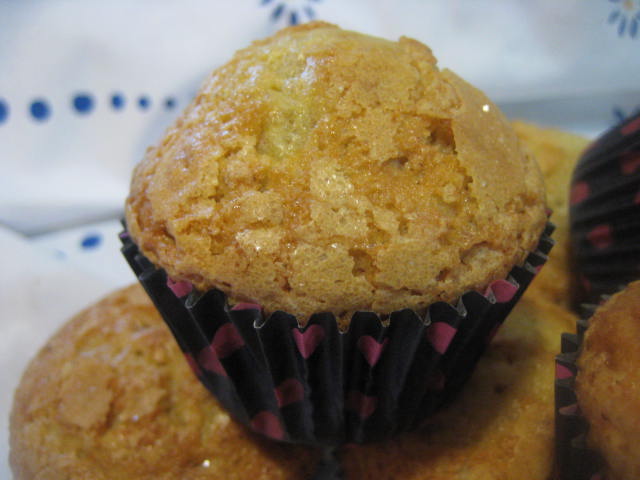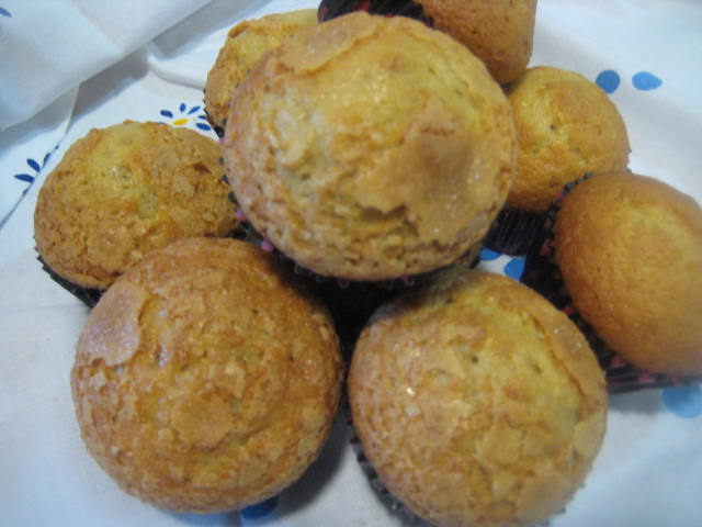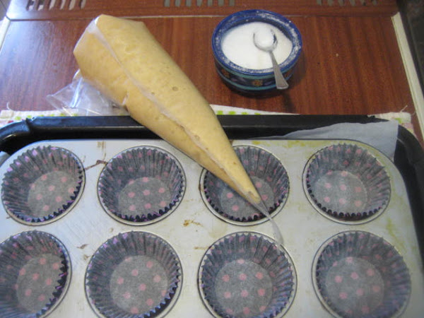 Preparación: Batir los huevos con el azúcar hasta que estén muy cremosos. Luego añadir el aceite a hilo fino mientras se continúa batiendo. Mezclar la harina con la levadura química o impulsor el pellizco de sal y la corteza finamente rallada de limón e ir agregando poco a poco y mezclando a mano con movimientos envolventes hasta haber añadido toda la harina. dejar reposar la masa en frío un par de horas en la nevera La suelo dejar hasta el día siguiente. Pasado el tiempo de reposo, remover la masa, poner en manga pastelera y llenar en sus 3/4 partes unos papeles de magdalena puestos en molde de cupcakes, de esta forma suben mejor porque la calidad de los papeles de magdalena deja mucho que desear.. Una vez escudillada la masa salpicar con azúcar granillo (he puesto mitad con azúcar y mitad sin azúcar) y hornear a 185º C aproximadamente durante 18-20 minutos. Aunque como siempre esto depende de los hornos. Pinchar para verificar que están hechas, desmoldar y dejar enfriar sobre rejilla, antes de consumir.
