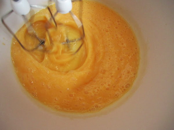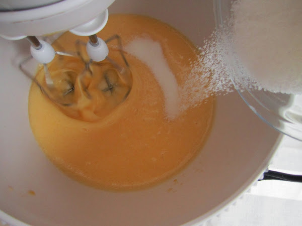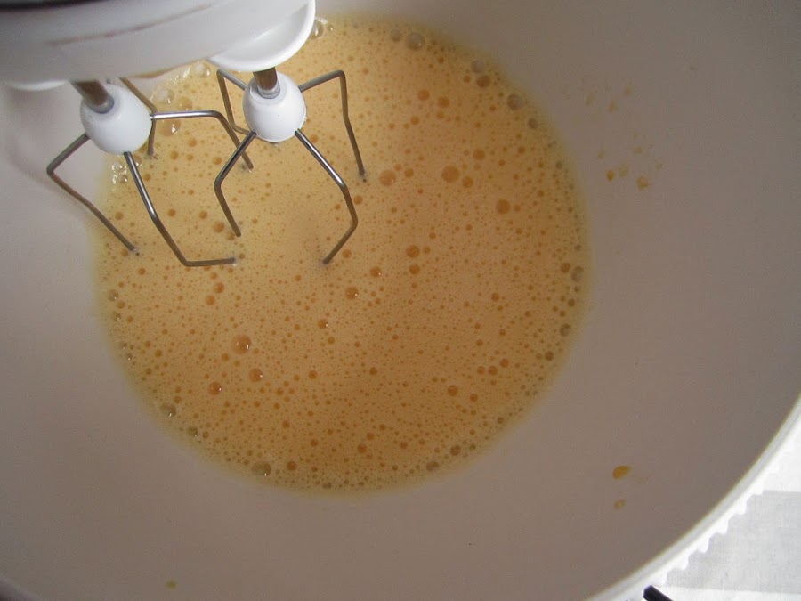 1. Bate el huevo con las varillas a velocidad media, cuando comience a espumar añade el azúcar. Acelera un poco la marcha de la batidora y bate hasta que la mezcla doble su volumen y adquiera un tono blanquecino (5-6 minutos)