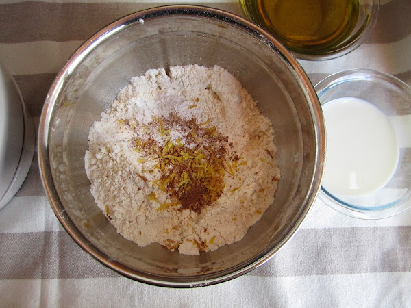 3. Mezcla los ingredientes sólidos: harina, sal, levadura, canela y limón.