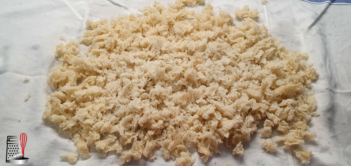 Con un cuchillo para pan, vamos retirando la corteza y una vez que esté sin corteza se va desmigando, en trozos pequeños.