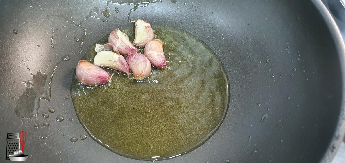 Se pone en la sartén el aceite a calentar, se añaden los ajos enteros, sin pelar, y con una pequeña incisión en el centro, y se doran. Cuando estén dorados se sacan y se reservan.