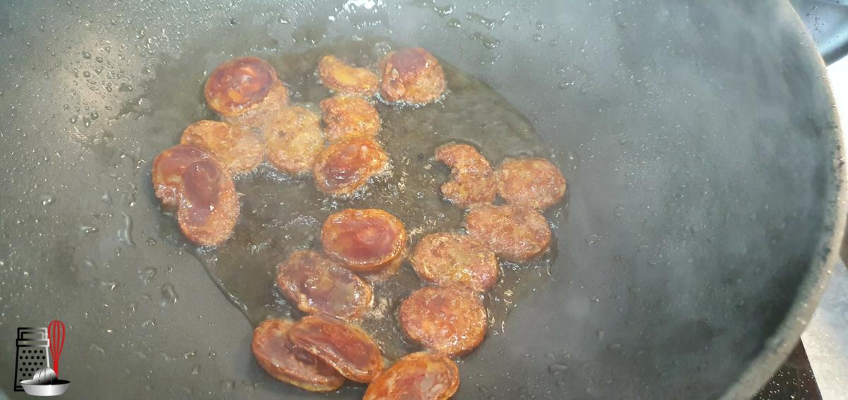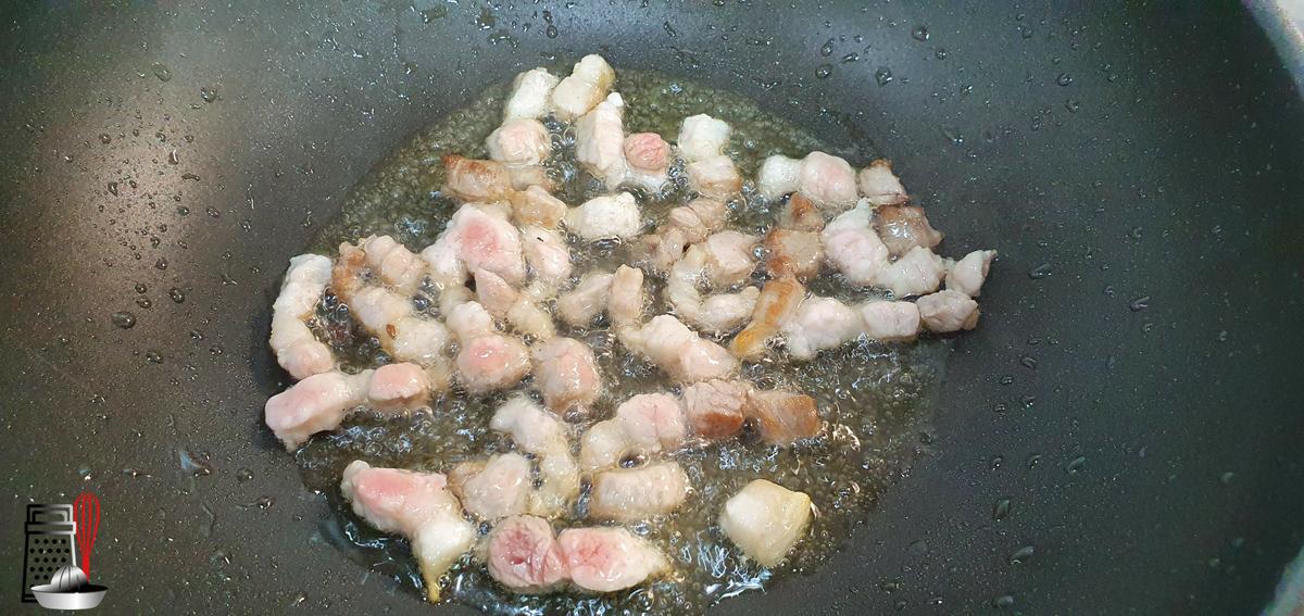 En ese mismo aceite se fríe el chorizo en rodajas finas, se aparta y se pone en ese aceite la panceta cortada en trocitos pequeños. Se aparta.