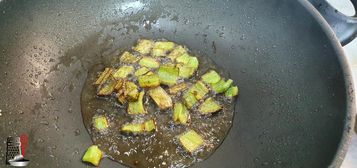 En ese mismo aceite se dora el pimiento cortado en trocitos. Se aparta.