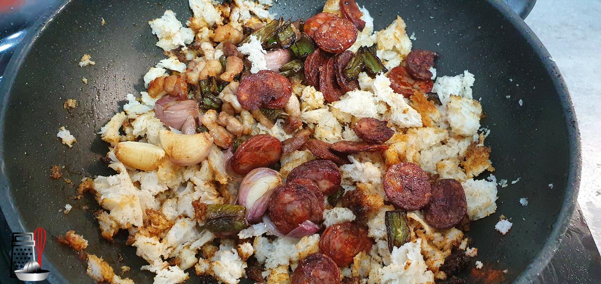 Se añade el pimentón a ese aceite y antes de que se queme, rápidamente, se añade el pan, se da un par de vueltas y se añaden todos los tropezones que hemos dorado y apartado.