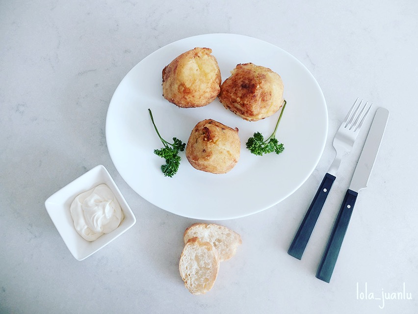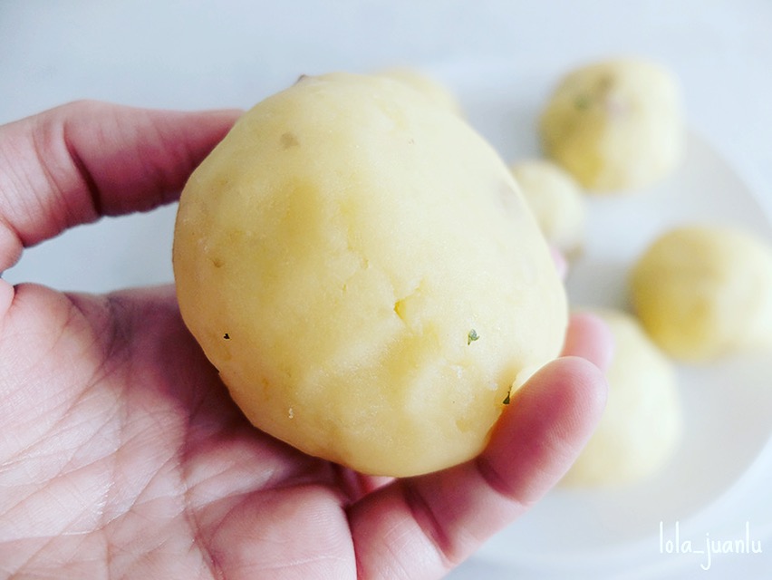 Ahora vamos a hacer unas bolas con un poco de puré de patata. Hacemos un hueco en el que colocamos la carne y moldeamos hasta que quede una bola de patata y no se vea el relleno de carne.