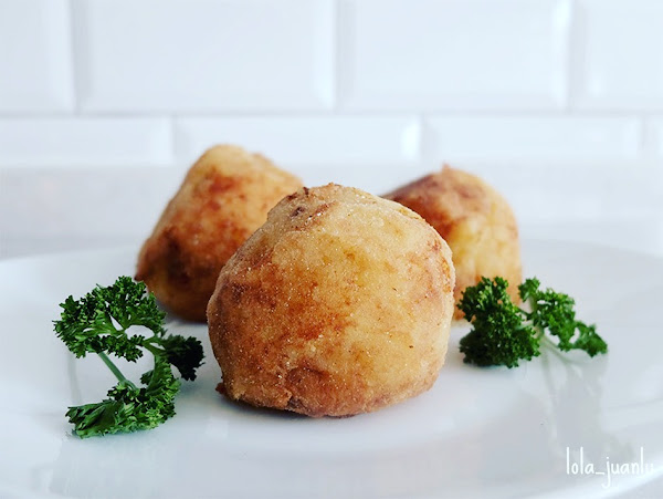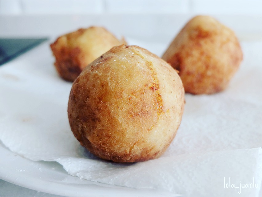 Echamos aceite en una sartén que ponemos al fuego. Cuando el aceite esté muy caliente, metemos nuestras bolas y las freímos.