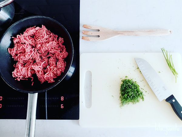 Mientras, vamos a hacer el relleno, para ello picamos el perejil y reservamos. Vertemos un chorreoncito de aceite de oliva virgen extra en una sartén que ponemos al fuego. Cuando el aceite esté caliente echamos la carne, el perejil y salpimentamos. Una vez la carne esté hecha, apartamos del fuego y dejamos enfriar.