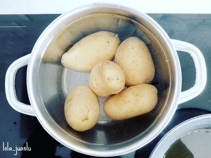 Lo primero que vamos a hacer es el puré de patata. Ponemos agua con sal en un olla, introducimos las patatas, ponemos el fuego alto y hervimos hasta que estén tiernas. Apartamos del fuego y dejamos enfriar.