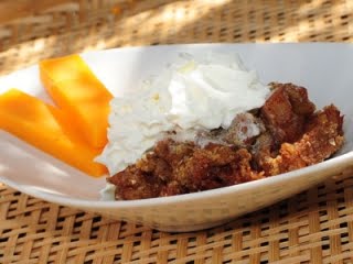 Echamos las migas encima de la fruta. Horneamos unos 40-45 minutos hasta que la fruta esté blanda y el relleno espumoso. Servimos caliente con queso cheddar y nata montada (crema de leche).