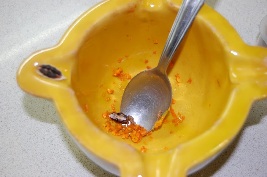 Abrir los cardamomos , añadir a la ralladura de naranja y majarlos en el mortero
