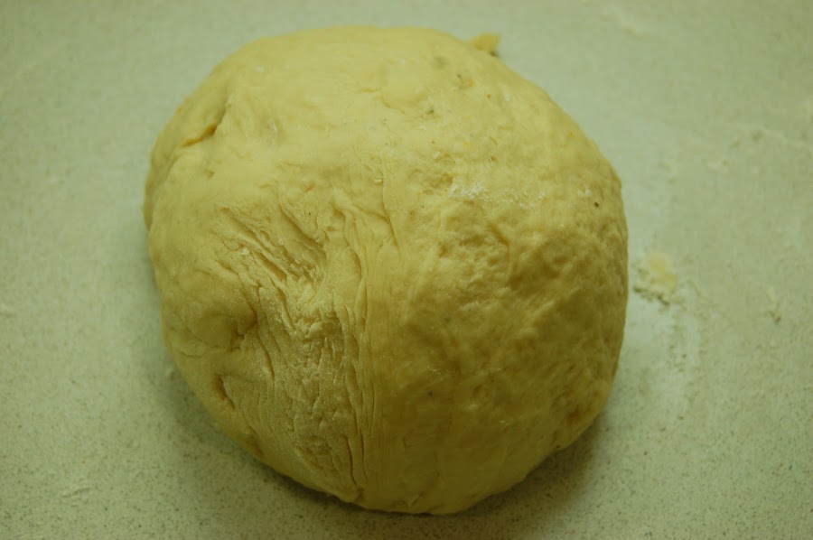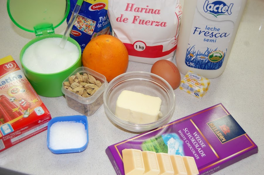Añadir la ralladura y el cardamomo ,incorporarle el huevo batido, la mantequilla y la esencia de vainilla, amasar hasta formar una bola homogenea, tapar y dejar reposar en un sitio cálido hasta que doble el volumen aproximadamente una hora.