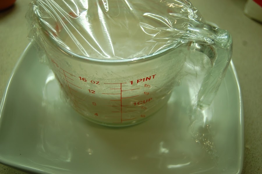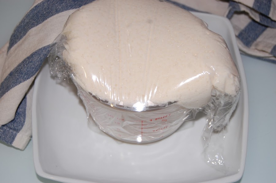 cubrimos con un film, lo ponemos sobre un plato por si se desborda , cubrimos con un paño para ocultarlo de la luz y lo dejamos reposar hasta que doble su volumen.