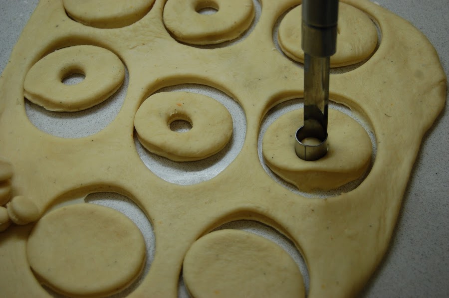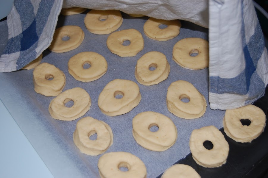Poner en una bandeja un papel de horno e ir depositando las rosquillas, tapar y dejarlas levar una media hora.