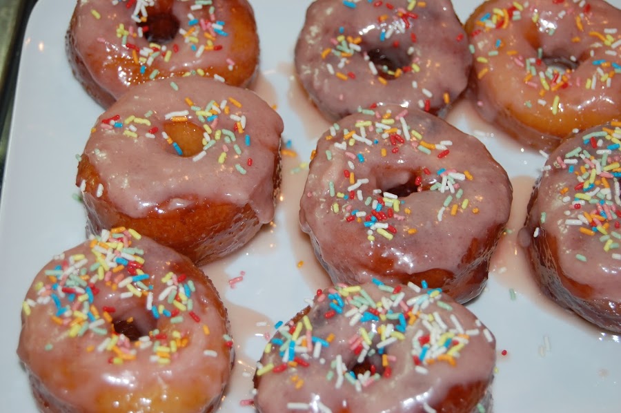 Derretir el chocolate con una cucharadita de mantequilla en el microondas, cuidando que no se queme, cuando esté disuelto añadir unas cucharaditas de la gelatina de fresa y pintar las rosquillas, decorar con fideos de colores.
