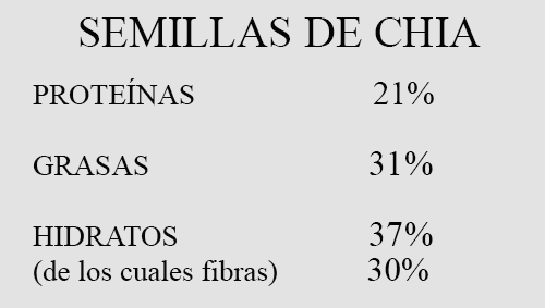 Las semillas de chía contienen un alto porcentaje de fibra (30%), tanto soluble como insoluble. Asimismo la chía es un buen remedio natural contra los problemas circulatorios, ya que contiene un alto porcentaje de ácidos omega 3 y ácido omega 6: ácidos grasos que reducen el colesterol malo y los triglicéridos y que, además, aumentan el colesterol bueno o HDL.