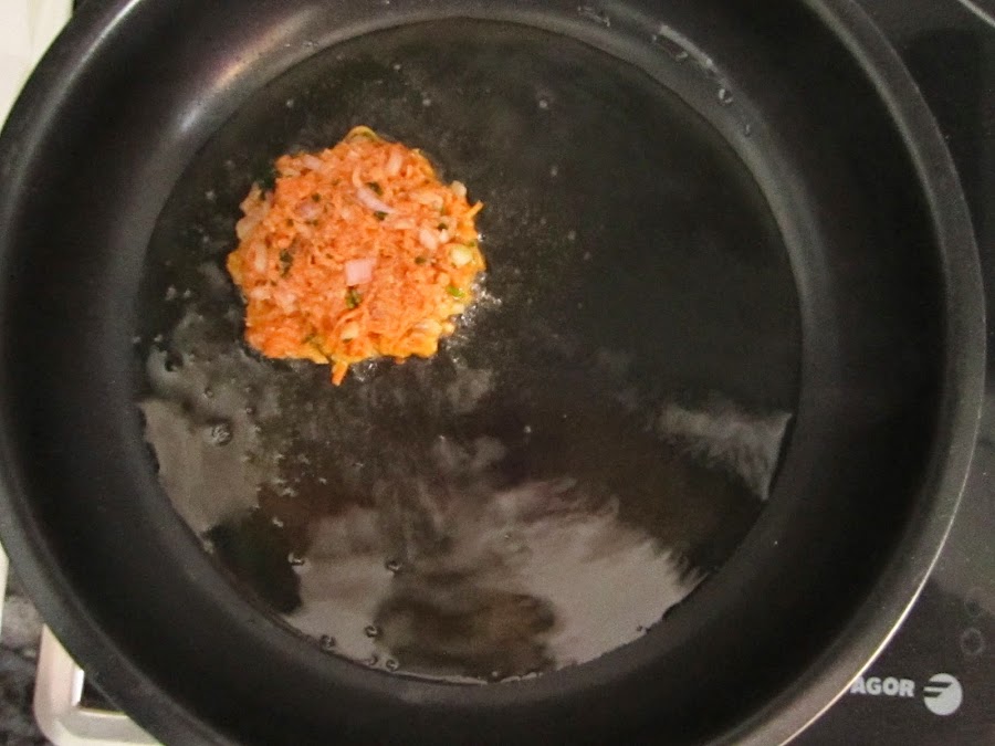 2. Cubre el fondo de una sartén de aceite y ponla a fuego medio alto. Cuando el aceite esté bien caliente, haz bolita del tamaño que desees con la mezcla de zanahoria y aplástalas un poco para darles forma de tortita. Después fríelas hasta que estén doradas y crujientes (aproximadamente 3-4 minutos por cada lado). Sacalas y déjalas reposar sobre papel absorbente para que suelten el exceso de aceite.