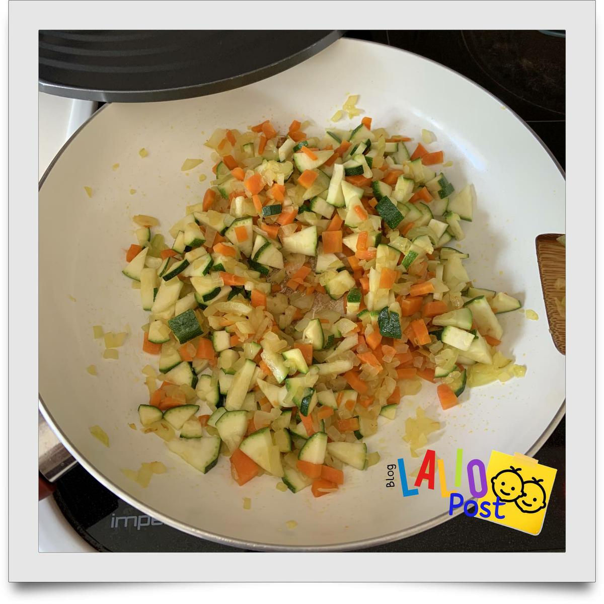 Cando la cebolla haya cambiado de color (se pone ligeramente más pálida) agregamos la zanahoria y cocinamos unos minutos.