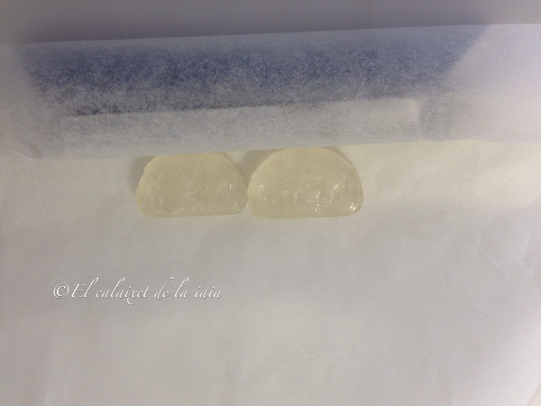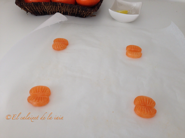 para montar nuestras "placas de lasagna" usaremos caramelos con sabor naranja. Pondremos dos gajitos de caramelo por cada placa, sobre papel sulfurizado o de horno, lo cubriremos con otra hoja de papel y los pondremos 180º durante unos siete minutos. Cada horno funciona de una manera, así que iremos abriendo y tocando, hasta que veamos que los caramelos se comienzan a poner blandos