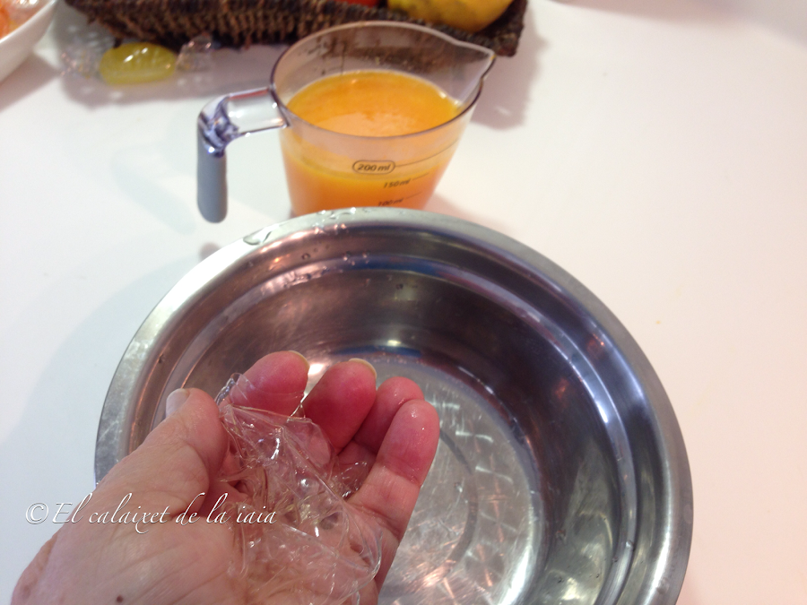 hidrataremos tres hojas de gelatina neutra en agua fría unos 5 minutos