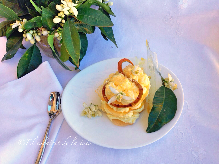 Antes de continuar quiero dar las gracias a mi amiga, que me ha traído unas florecitas de azahar de los naranjos bordes que tiene en el jardín de su casa. Sabedora de que me embriaga el aroma "datzahar", en cuanto florecen me trae un ramito, y ésta vez he aprovechado unas florecillas pra mejorar la presentación de mi postre. Gracias cariño.