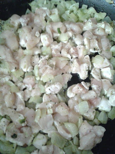 -Añadir el pollo picado menudo ya salpimentado.