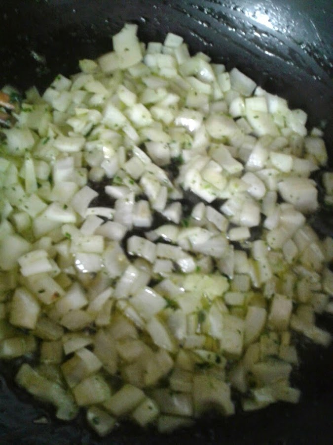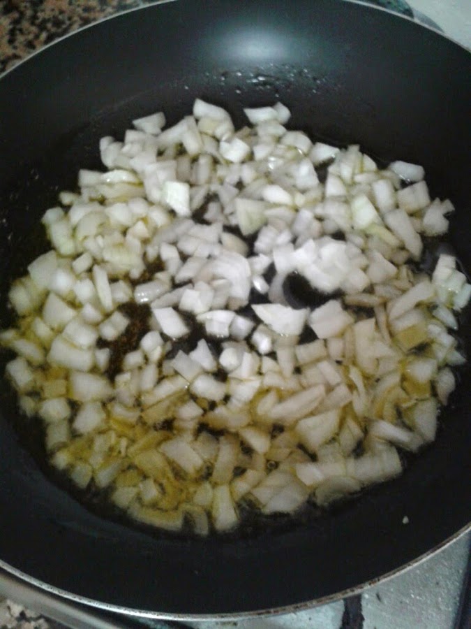 - Picamos la cebolla y ajos pequeñitos y en una sartén, pochar en un poquito de aceite.
