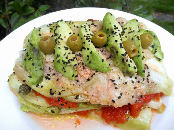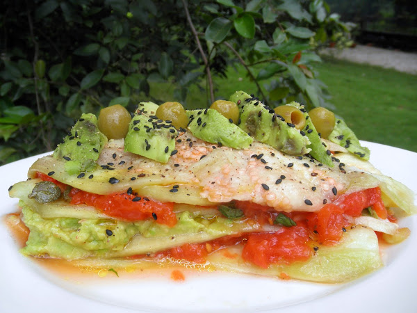 Terminar con una capa de berenjenas que cubriremos con láminas de aguacate, aceitunas verdes sin hueso laminadas y semillas de sésamo negro. Se puede finalizar con un pequeño hijo de aceite de oliva virgen extra opcional.