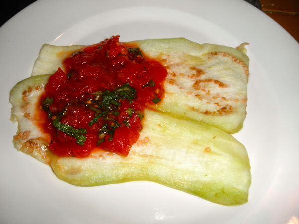 Extender una primera capa de relleno de tomate y hierbabuena y unas alcaparras sobre la base de berenjena y cubrir con una segunda capa de berenjenas escurridas y secadas.