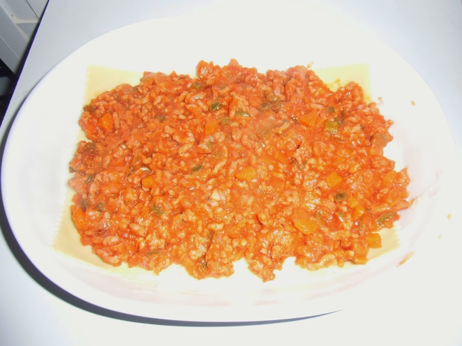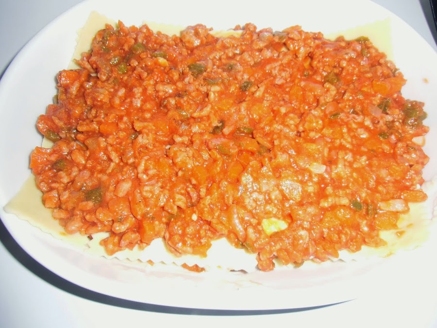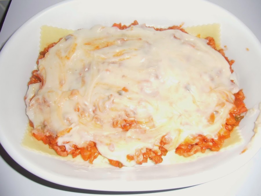 Otra vez una capa de placas de pasta, otra de boloñesa y otra de bechamel