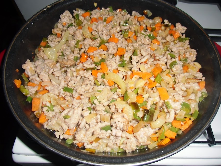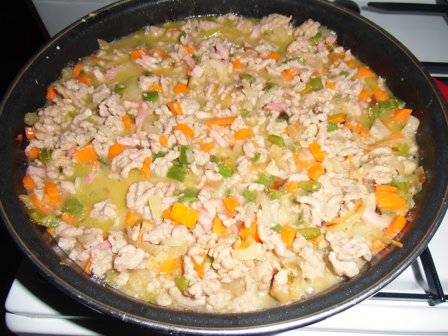 Vamos cocinando a fuego suave y cuando veamos que la verdura está mas o menos pochada añadimos las carnes picadas de cerdo y ternera previamente salpimentadas, damos vueltas cocinándolo hasta que tomen color e incorporamos el bacon cortado a trocitos