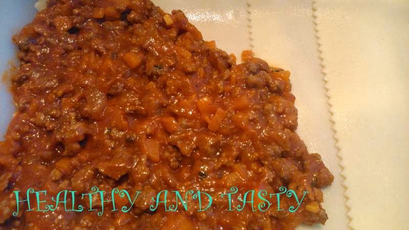 Comenzamos a montar la lasaña. En una fuente de horno, ponemos un poco de tomate frito en el fondo, para que la pasta no se pegue. Encima, colocamos 4 láminas de pasta y las cubrimos con la mitad de la salsa boloñesa.