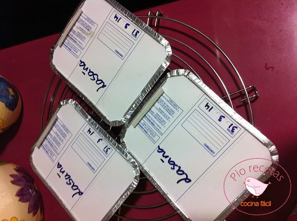 Para montar las lasañas usé los moldes desechables que podéis encontrar en supermercados.Así lo tenemos de forma individual y lo podemos congelar directamente.Ponemos la fecha en la tapa y listo.Podemos descongelarlo en la nevera o meterla directamente al horno.Me salieron 3 raciones con estas cantidades y las congelé para que no se estropearan.