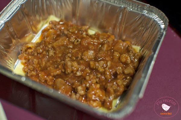 Para montar la lasaña ponemos una placa de pasta en el fondo del molde,cubrimos con la salsa de carne y tapamos con otra capa de pasta.