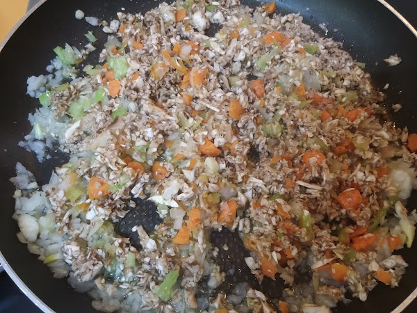 Picamos bien la cebolla, zanahoria, apio, ajo y champiñones y los sofreímos en una sartén amplia con un chorreón de aceite.