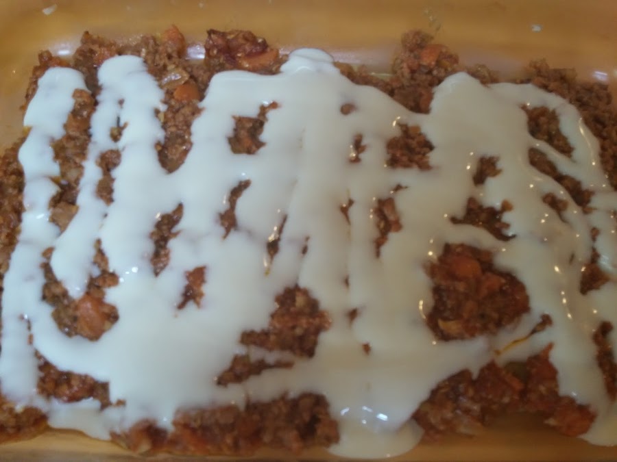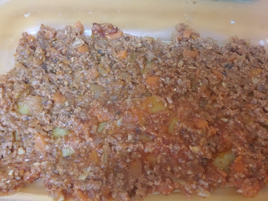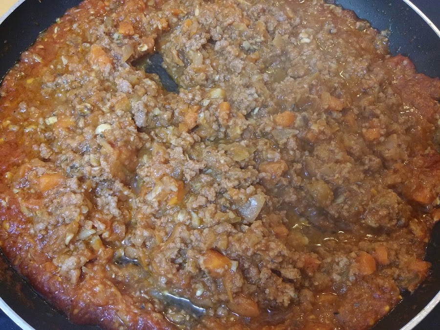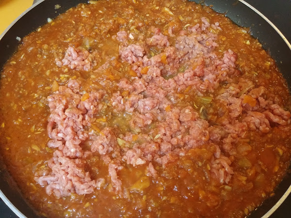 A continuación añadimos la carne picada y orégano al gusto. Salpimentamos y dejamos otro buen rato, 20 o 30 minutos. Ponemos a precalentar el horno a 180 grados.