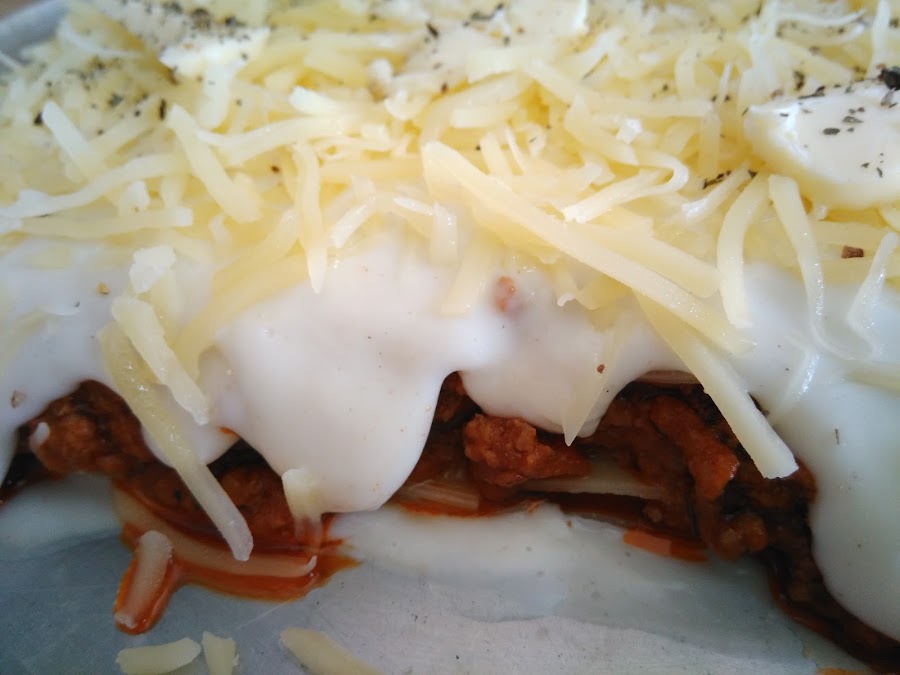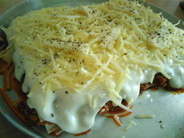 En una fuente, colocamos un poco de bechamel, placas de lasaña, salsa boloñesa y un poco de bechamel, y repetimos placas-boloñesa-bechamel, tantas capas como deseemos, para terminar con una capa de placas de pasta. Cubrimos con bien de bechamel y queso rallado. Espolvoreamos albahaca y pimienta negra recien molida. Añadimos un poco de mantequilla en lascas.