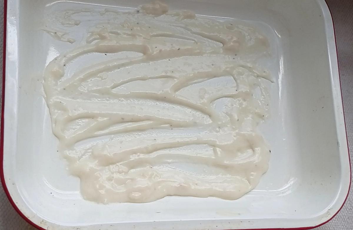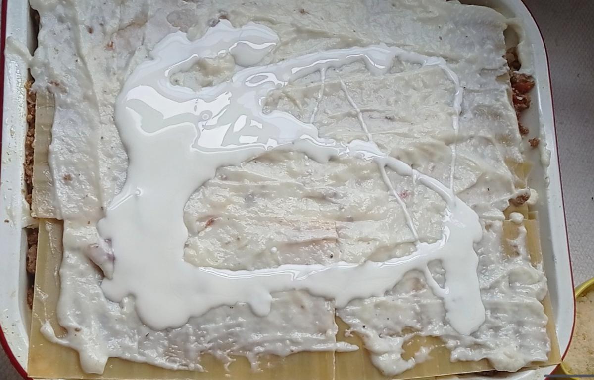 Cubrimos con la ultima capa de laminas de lasaña, distribuimos encima salsa bechamel, crema y queso rallado.