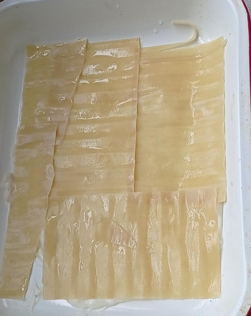 Pasamos las láminas de lasaña por agua hirviendo unos segundos, para que se ablanden un poco, puedes ponerlas directamente pero yo prefiero este método, y separarlas porque se pegan.