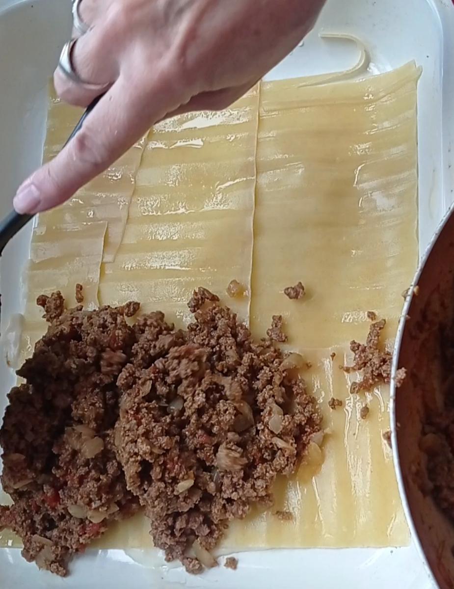 Armado: en una fuente para horno, distribuir un poco de salsa bechamel y una capa de láminas de lasaña, encima el relleno de carne picada y puede poner un poco de queso cremoso, y un poco de salsa bechamel, acordate de guardar para la última capa.
