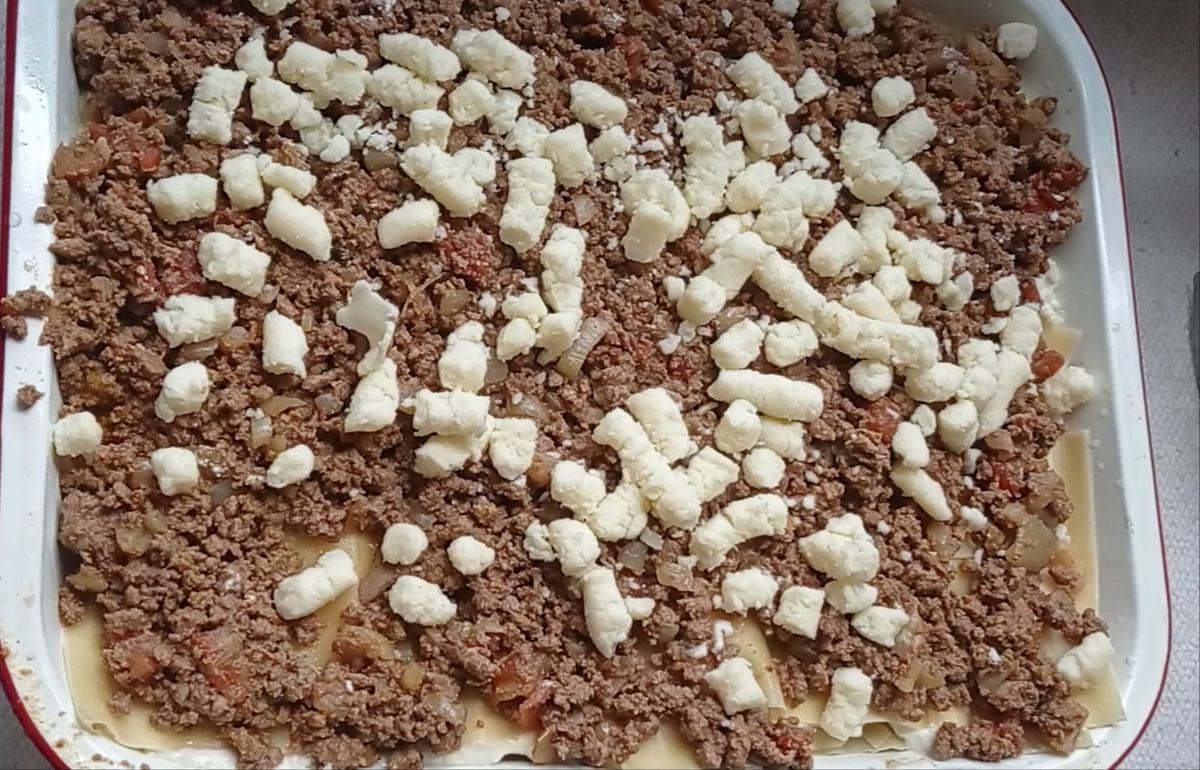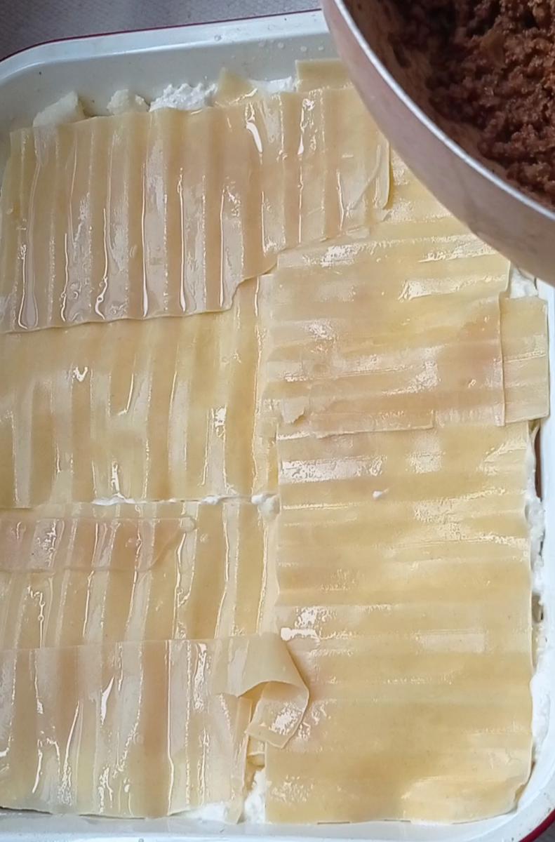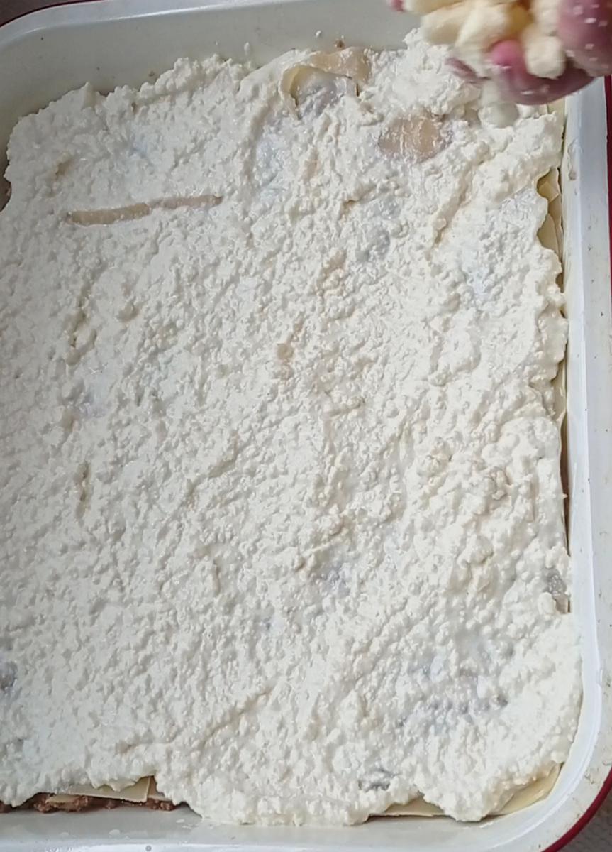 Cubrir con otra capa de laminas de lasaña, y encima el relleno de ricota, con un poco de queso mozzarella y cubrir con otra capa de lasaña, y el resto de carne picada.